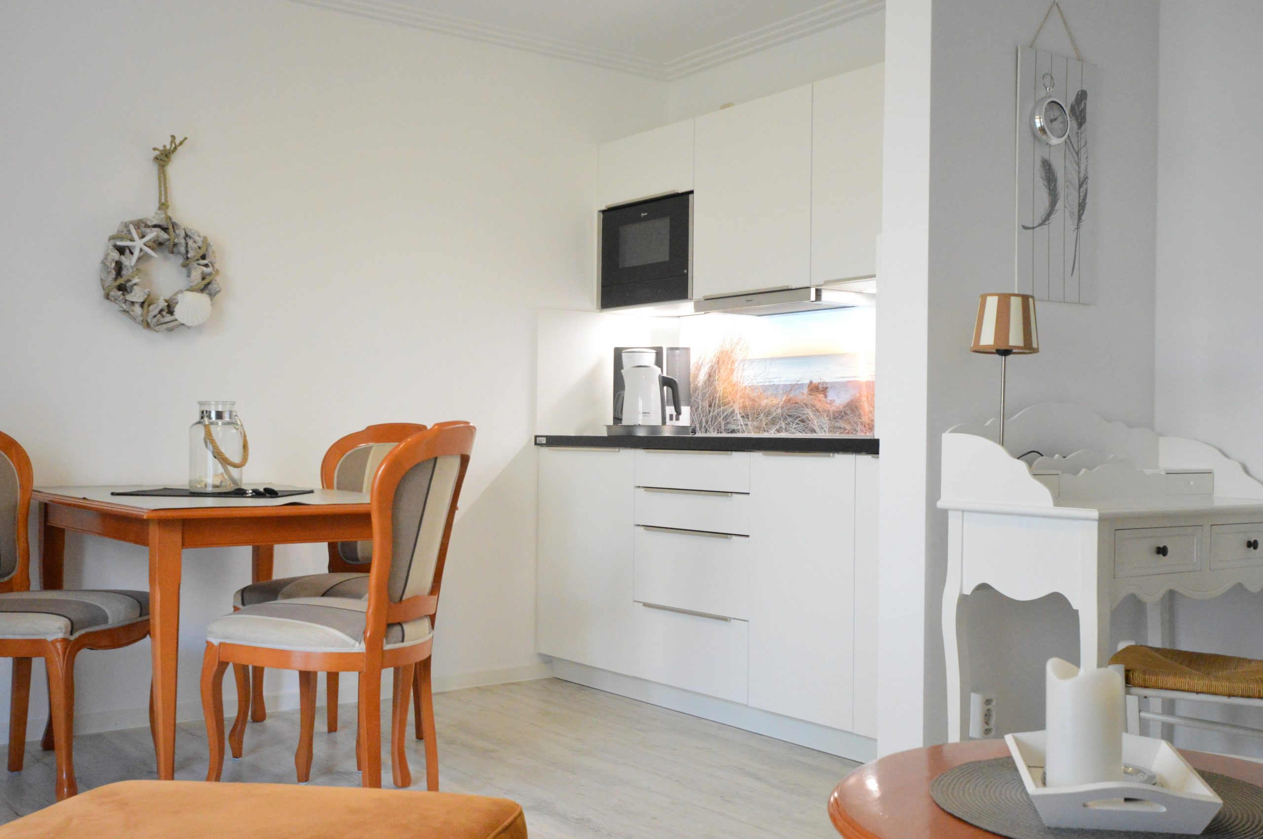 Der Wohnraum des Apartments bietet Ihnen einen Koch- und Essbereich inkl. einer Einbauküche mit Cerankochfeld, einer Mikrowelle mit Backfunktion, einem Geschirrspüler, einem Kühlschrank mit Gefrierfach sowie einer Kaffeefiltermaschine, einem Toaster und einem Wasserkocher.